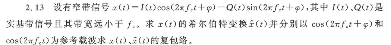题目 2.13:设有窄带信号 x(t)=I(t)cos(2πfct+φ)−Q(t)sin(2πfct+φ),其中 I(t)、Q(t) 是实基带信号且其带宽远小于 f_c。求 x(t) 的希尔伯特变换 x̂(t) 并分别以 cos(2πf_c t + φ) 和 cos(2πf_c t) 为参考载波求 x(t)、x̂(t) 的复包络