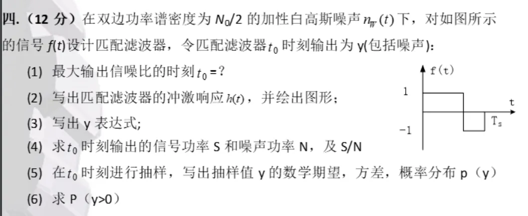 题目:在双边功率谱密度为 N0/2 的加性白高斯噪声 nw(t) 下,对如图所示的信号 f(t) 设计匹配滤波器,令匹配滤波器 t0 时刻输出为 γ (包括噪声)。